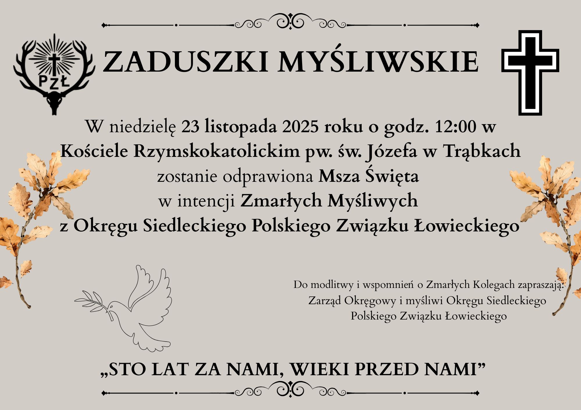 Zarząd Okręgowy PZŁ w Siedlcach serdecznie zaprasza Koleżanki i Kolegów wraz z rodzinami dnia 23.11.2025 r. o godzinie 12:00 do Kościoła Rzymskokatolickiego pw. św. Józefa w Trąbkach na Zaduszki Myśliwskie (ul. Graniczna 3A, 08-440 Trąbki).